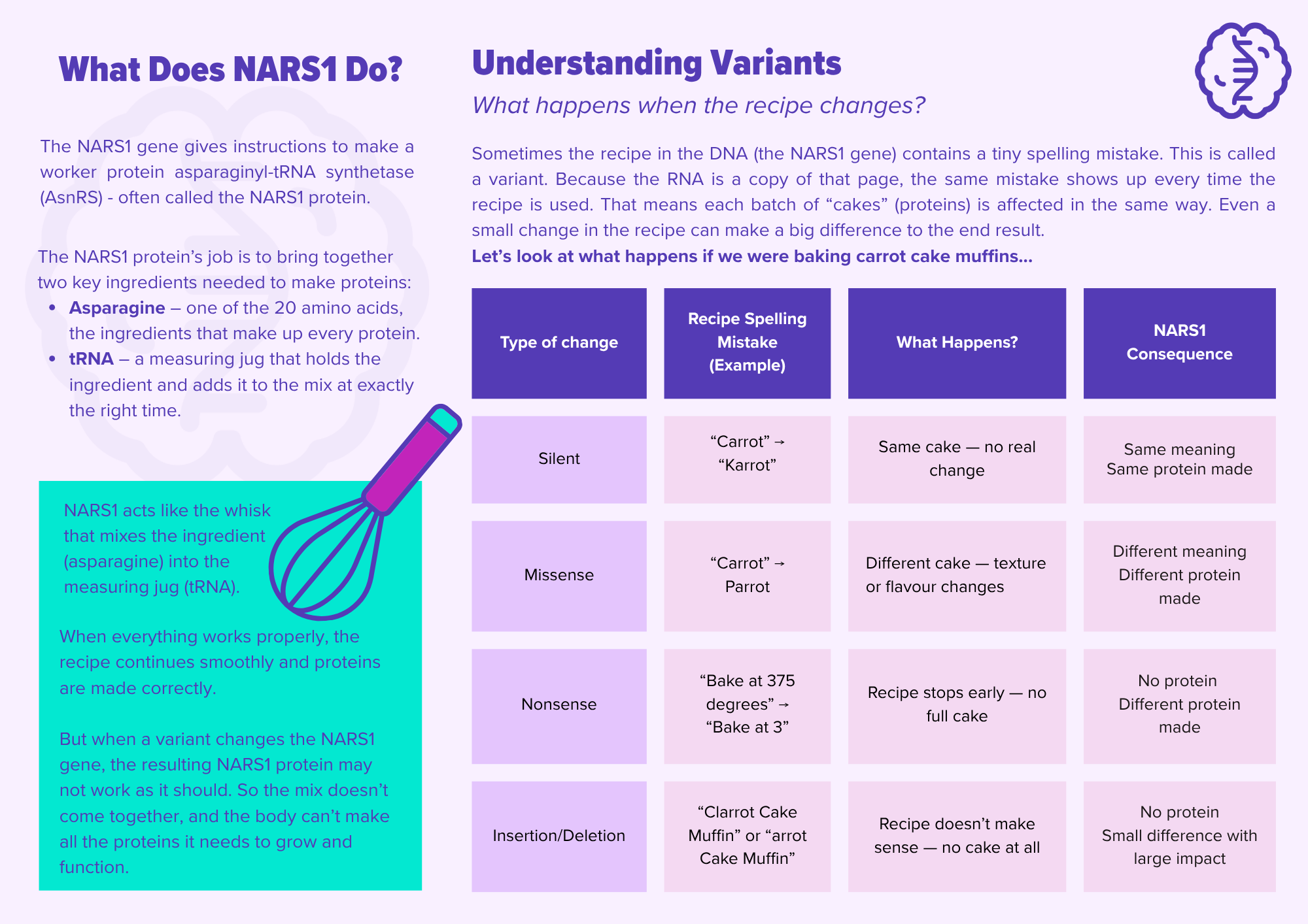 When there’s a change, or mutation, in the NARS1 gene, it can’t do its job properly. This means that our bodies can’t make the right proteins. And proteins are like the workers in our bodies—they help us grow, move, and stay healthy.